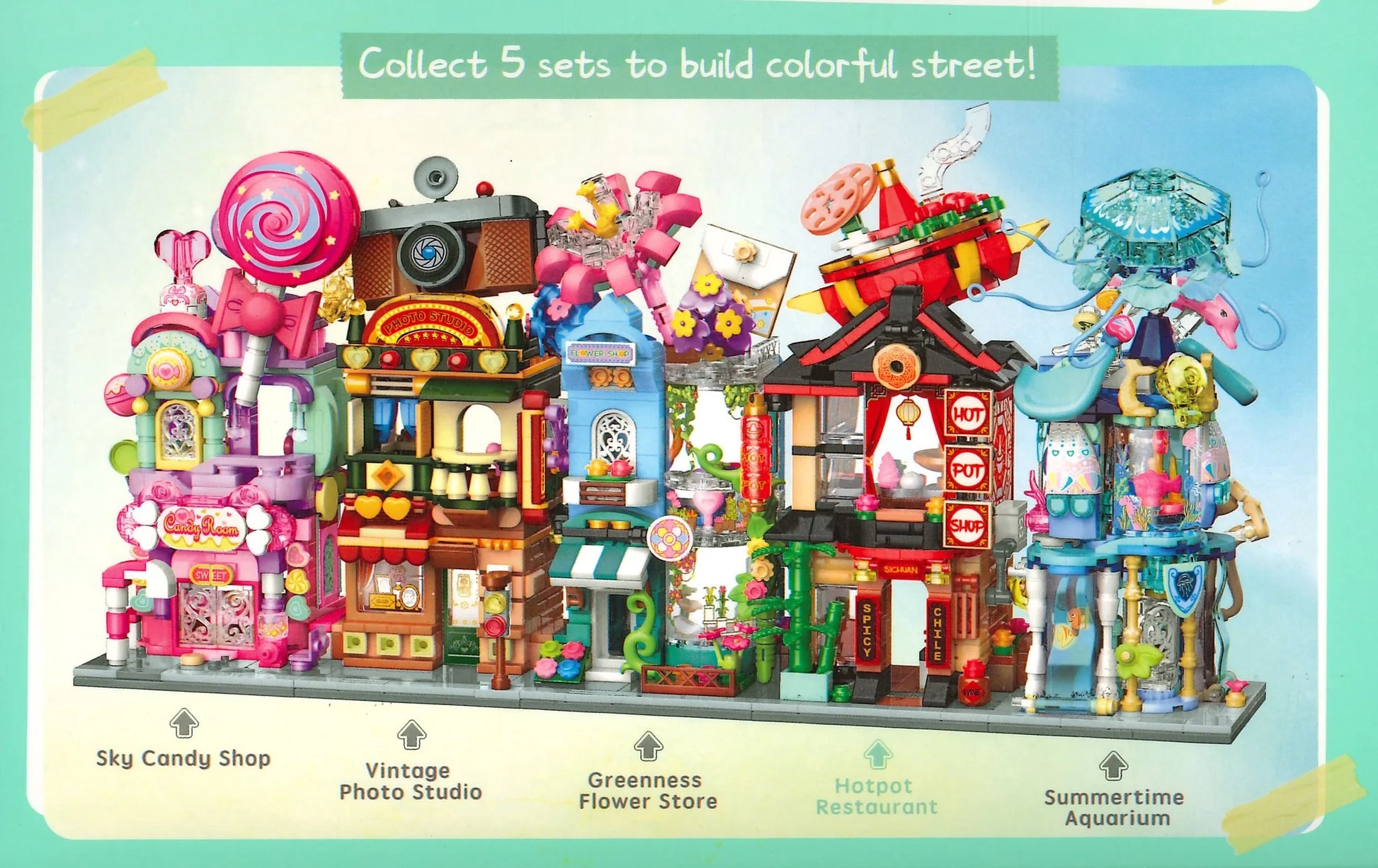 Sky Candy Shop è un modello modulare dettagliato e compatibile con i mattoncini LEGO, ideale per collezionisti e appassionati dai 6 anni in su.