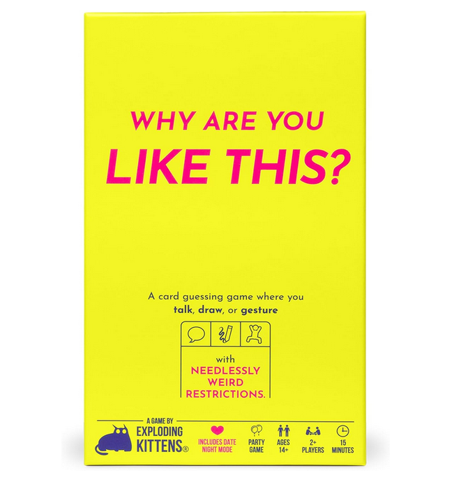 Un gioco di società a squadre che combina parole da indovinare con sfide di comunicazione insolite: parlare, disegnare o mimare con divieti bizzarri. Ad esempio, fate indovinare “carota” parlando con la lingua fuori o disegnate senza toccare la penna con le mani. Vince la squadra che indovina più parole entro il tempo stabilito. Perfetto per gruppi di 2 o più giocatori, dai 14 anni in su, con partite rapide di circa 15 minuti. Edizione in italiano per un divertimento garantito e stimolante.